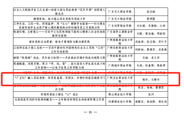 其中,由宣传统战部宋骋丹老师指导,何梓炫、黄小敏、蒙姿廷同学拍摄的校园风采作品《白衣芳华,点燃生命之光!》荣获主题摄影类一等奖;由马克思主义学院郭晓纯老师指导,陈芷程、赵若含、魏文豪、罗金龙、吴光圳、钟天蓝、陈鈴译、李杏、钟斯闲、聂婧嫚同学参与的《医脉传承》荣获舞台剧目类一等奖;由宣传统战部陈丹、宋骋丹老师报送的工作案例《“广卫红”融入思政教育:培养显温度、见担当、有情怀的基层健康守门人》荣获工作案例类三等奖。