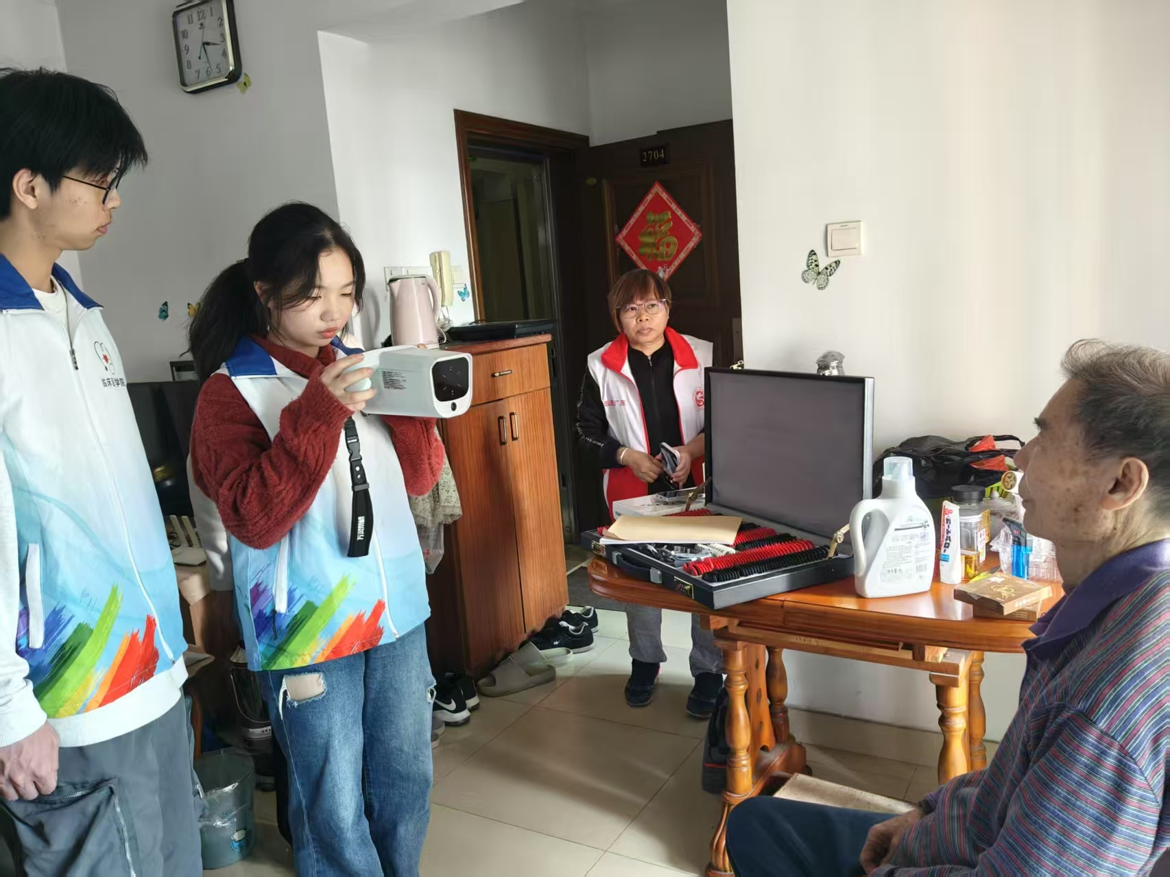 此次活动由临床医学院实训中心副主任容子洲老师带队,学生志愿者为5户特困视障老人精准验光配镜;慰问10户特困老人,送上物资与关怀。在龙津华府广场,团队还设点科普,通过专业讲解和资料发放,普及白内障等眼病防治知识,提升居民眼健康意识。
