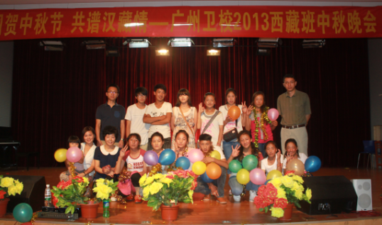 下午,西藏班的同学们以及应邀参加晚会的大专学生党员、入党积极分子、大专1307检验班的学生代表早早聚集在四楼师生活动中心,挂彩带、绑气球、系横幅、排桌椅、摆零食、调设备、彩排节目,大家齐心协力把中秋晚会的会场布置得充满节日的气氛。夜幕降临,一轮明亮的圆月升上天空,四楼学生活动中心灯光闪耀,音乐飘荡,“同贺中秋节,共普汉藏情——广州卫校2013西藏班中秋晚会”正在进行。师生共聚一堂,享用月饼、水果和零食,欣赏舞台上一个接着一个的精彩表演,其乐融融。能歌善舞的藏族学生们穿上了漂亮的传统藏族服饰,轮番在舞台上为大家献上或抒情或奔放的歌曲,表演动感十足、热情潇洒的藏族舞蹈。节目上演到最后,掀起了全场的高潮,台上台下、观众演员、老师学生一起跳起了热情奔放、节奏明快的锅庄舞,欢乐的气氛飘荡在中秋晚会会场的每一个角落,飘荡在参加晚会的所有师生的心窝里——熟悉的音乐、心爱的舞蹈,原来家就这么近!