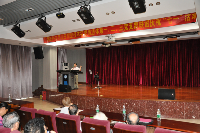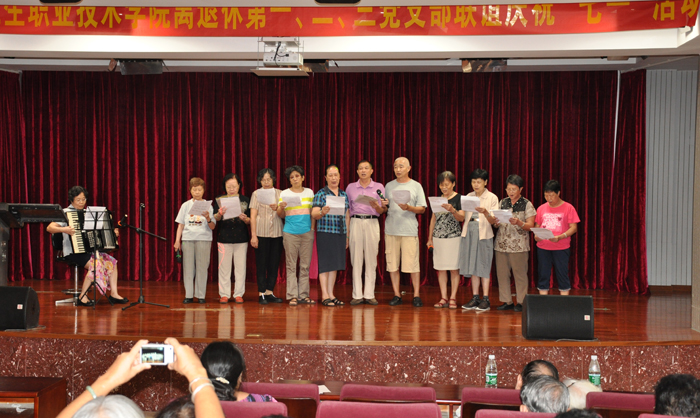 这次活动安排非常丰富,人事科(离退办)副科长黄雪群发表庆祝七一讲话;邀请三位离退休党支部书记讲话;接着是各支部党员以载歌载舞的方式进行文娱汇演,如:离退休第二党支部小组唱《我祝祖国三杯酒》、《踏浪》;离退休第二党支部党员张光龙表演男生独唱;离退休第二党支部党员冯卫生和李兰英表演诗朗诵《颂七一》;离退休第二党支部党员伦凤群表演葫芦丝独奏。虽然节目不多但非常精彩,获得了观众们阵阵掌声。
