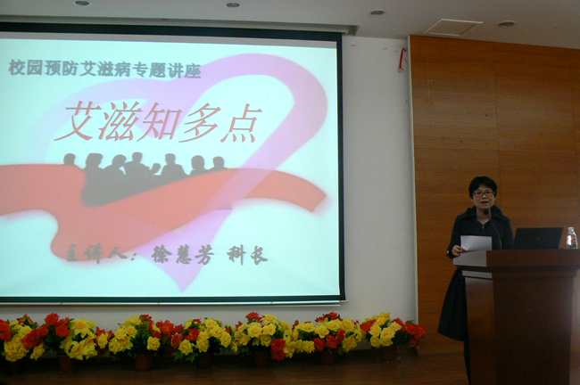 徐慧芳主任从事艾滋病预防控制工作20多年,具有丰富的艾滋病监测和预防控制的工作和研究经验。她首先向我们介绍了艾滋病的总体疫情情况,再根据详细的数据分析了艾滋病在学生群体中呈现逐渐上升趋势的四大原因,然后带我们继续深入探究导致人类患艾滋病的多种原因和途径,教我们如何有效地预防艾滋病。最后,她呼吁大家:应洁身自好,注意安全卫生,积极行动起来预防艾滋病,帮助身边的人掌握预防艾滋病的知识。同时,消除歧视,关爱艾滋病患者。