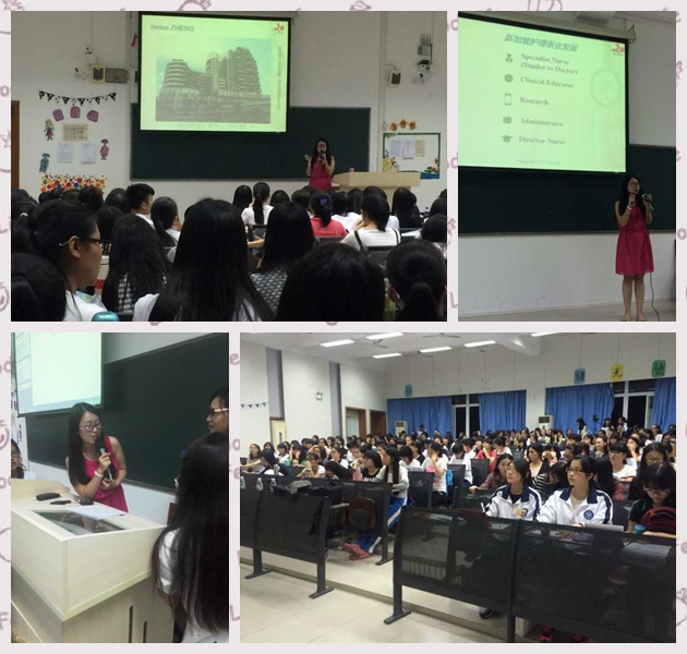 黄文静老师从自己个人在新加坡的学习经历娓娓道来,极大激发了学生的兴趣,紧接着介绍了新加坡护理事业发展的现状,用视频展示新加坡先进医疗设备及技术,并向学生传达了新加坡减轻护士工作量、为护士提供优良环境的医疗理念,其中突出护士在新加坡就业的良好待遇和福利。最后对有意向赴新加坡的同学说明了要求和其中的课程考试等流程,,并邀请学生们参加下次系统的答疑会。