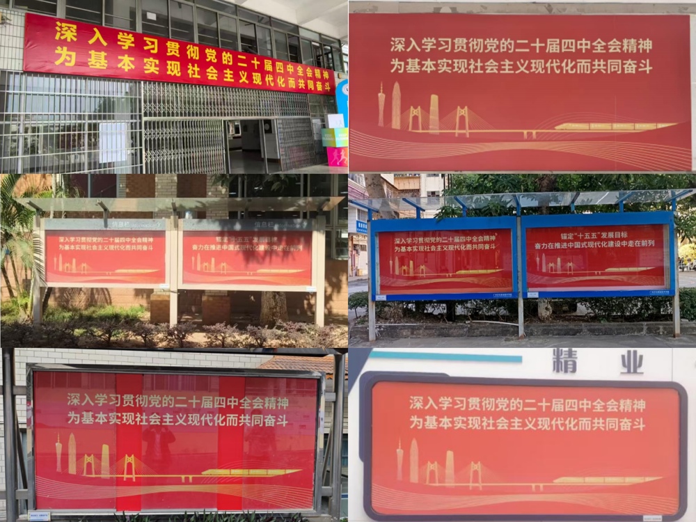 学校坚持用浅显易懂的语言和师生喜闻乐见的方式使党的二十届四中全会精神在师生中入脑入心。组织征订《党的二十届四中全会(建议)学习辅导百问》等学习用书,号召全体师生自觉学习宣传贯彻党的二十届四中全会精神。在6个校区布置党的二十届四中全会宣传海报和宣传标语,在官方网站增设主题宣传海报,积极营造学习宣传贯彻党的二十届四中全会工作宣传氛围。组织党员群众参观广州市地方志馆,了解中国共产党领导广州抗战的光辉历程,深化党史学习教育,锤炼党性修养。