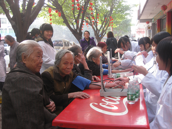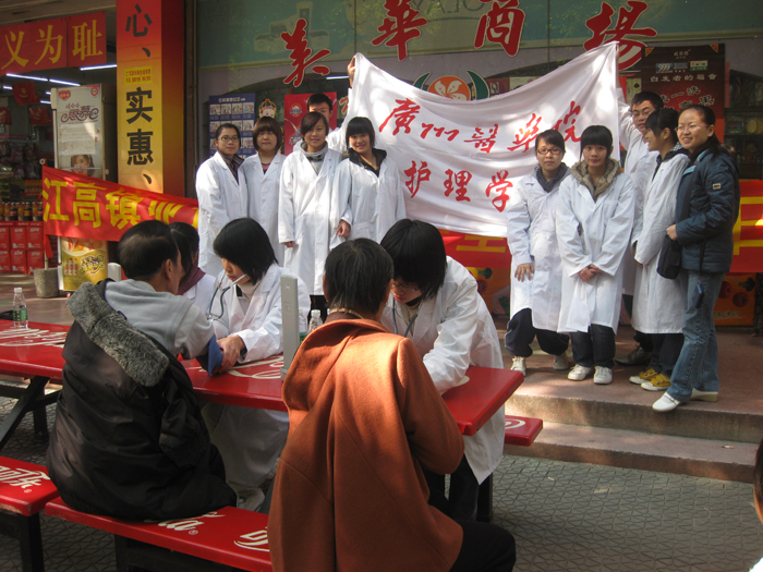 12月5日上午,由江高镇团委与我院/校团委共同组织的“迎亚运·志愿者日献爱心——江高义诊活动”在江高美华商场门口顺利举行,护理学部熊映红老师带领08级大专11名同学到江高镇为当地老百姓义诊。