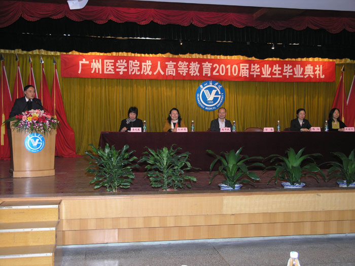 2009年12月26日上午,我院在广州医学院体育馆礼堂隆重举行成人高等教育2010届毕业生毕业典礼。出席毕业典礼的有广州医学院常青副校长、广州医学院继续教育学院成教部王杜娟副主任、省人民医院护理部黄蝶卿副主任以及我院陈伟民书记、陈沁院长、余大敏副院长、继续教育与培训中心主任、各学部专业教师代表、07级各班班主任。共有护理学(专升本),专科护理、药学、临床医学、医学检验技术、口腔医学、康复治疗技术等专业的1208名毕业生顺利完成学业。