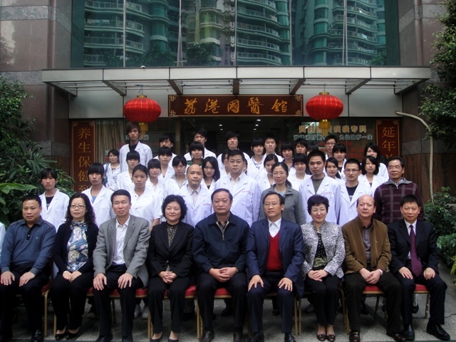 王副部长一行与荔港国医馆相关人员、我校陈沁校长及中医康复保健班同学合影