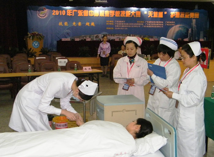 为全面提高我省护理教育的整体水平和护理队伍后备人才的整体素质,促进我省护理专业教育事业的发展,由广东省教育厅主办,广东省职业技术教育学会和广州市教育局承办,我校和广东卫生职业教育协会协办的2010年广东省中等职业学校技能大赛“天堰杯”护理技能竞赛于4月10-11日在广州医学院体育馆三楼礼堂隆重举行。