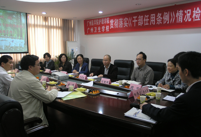 2010年4月23日上午,广州市委组织部检查组一行四人在广州医学院组织部何朝辉副部长的陪同下莅临我校,对我院/校2008年以来贯彻执行《干部任用条例》情况进行专项检查。我院校领导及党委/院校办公室有关人员参加了会议。