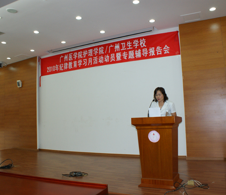2010年9月13日下午,我院/校召开了纪律教育学习月活动动员暨专题辅导报告会。会议对今年开展纪律教育学习月活动进行了动员和部署。白云区检察院罗俏兰副检察长、我院/校汪志标书记、陈沁院/校长、卢穗华副书记、周英副院/校长、余大敏副院/校长及全校教职工参加了大会,会议由卢穗华副书记主持。