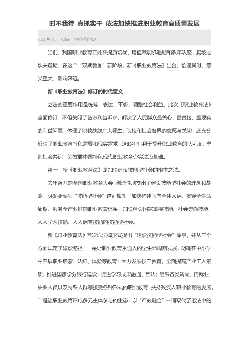 时不我待 真抓实干 依法加快推进职业教育高质量发展